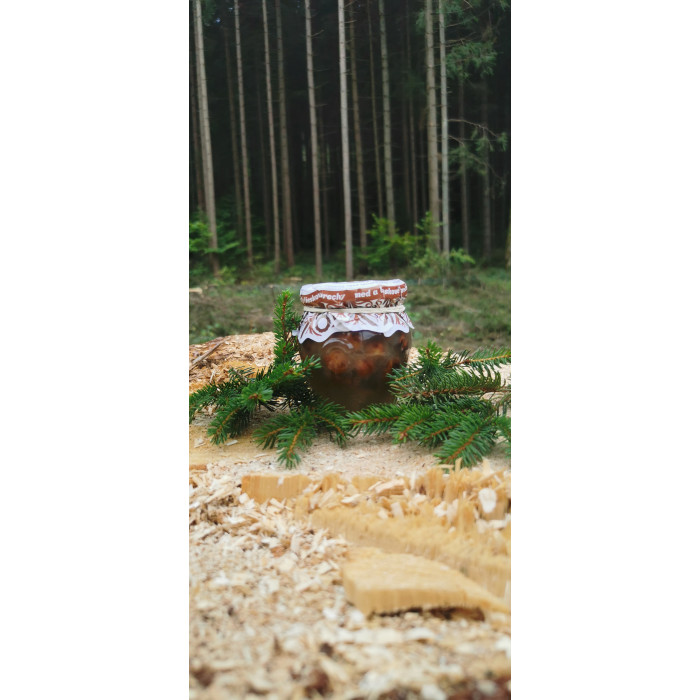 Kúsky ovocia (правдоподібно, ягоди) konzervované v mede. Sladko-kyslý dezert з ovocným podtónom.